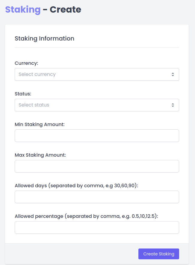 - Allowed percentage (separated by comma, e.g. 0.5,10,12.5) - the system displays reward in percentage user gets after staking period ends.